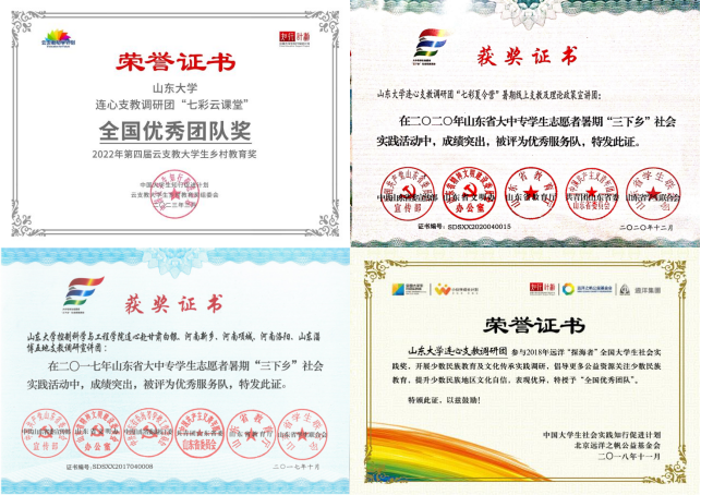 山东大学学生连心支教调研团连续多年被评为山东大学优秀社会实践团队、山东省优秀社会实践团队,获评2019年“榜样100”全国最佳大学生社团,曾获2022年第四届大学生云支教乡村教育奖、阿克苏诺贝尔全国大学生社会公益奖、全国远洋之帆大学生社会实践奖等。