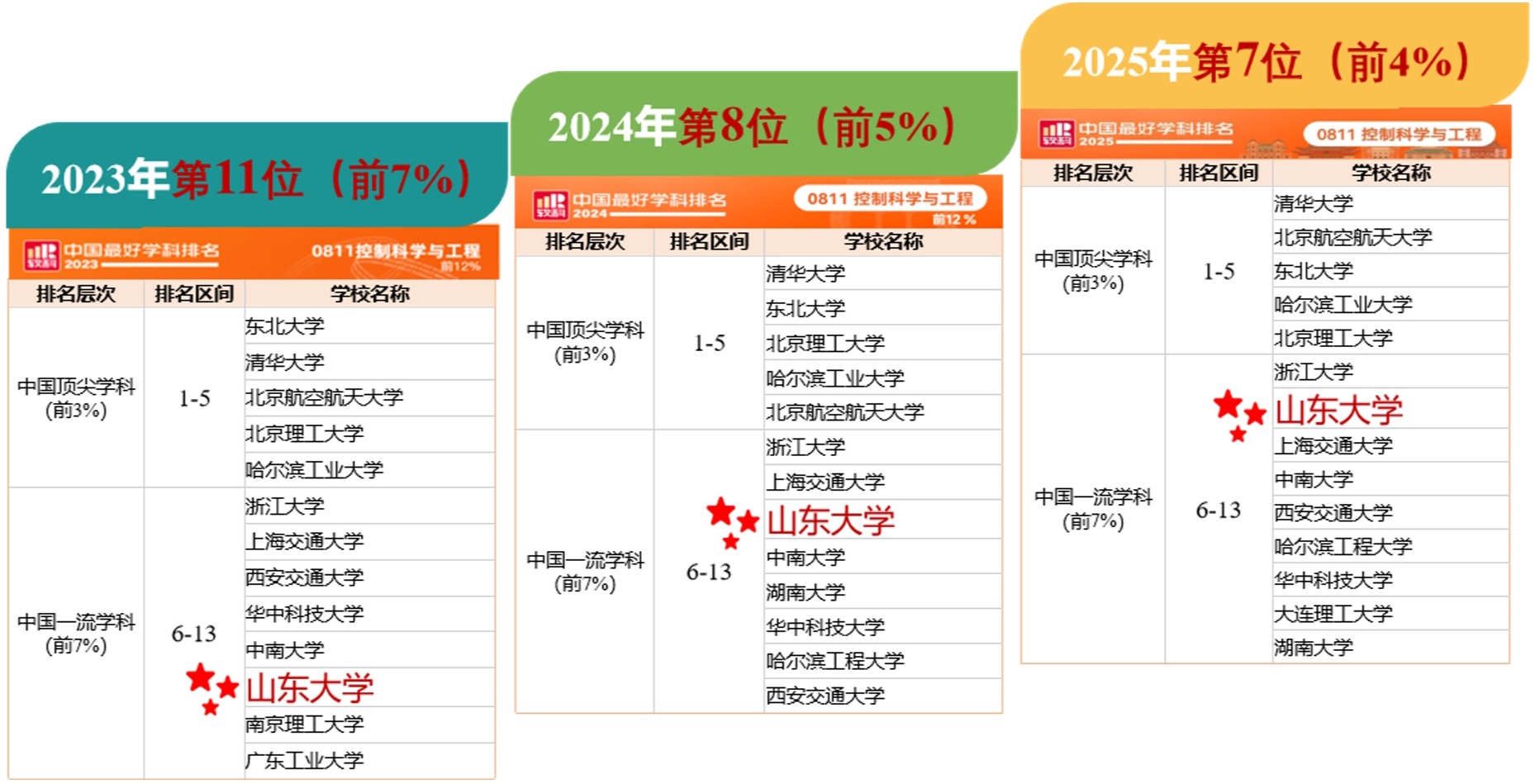 近3年山东大学控制学科软科排名